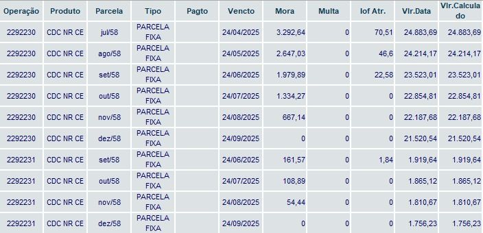 | CCB | Valor da NF (R$) | Valor Financiado (R$) | Entrada Paga (R$) | Parcelas Pagas (R$) |